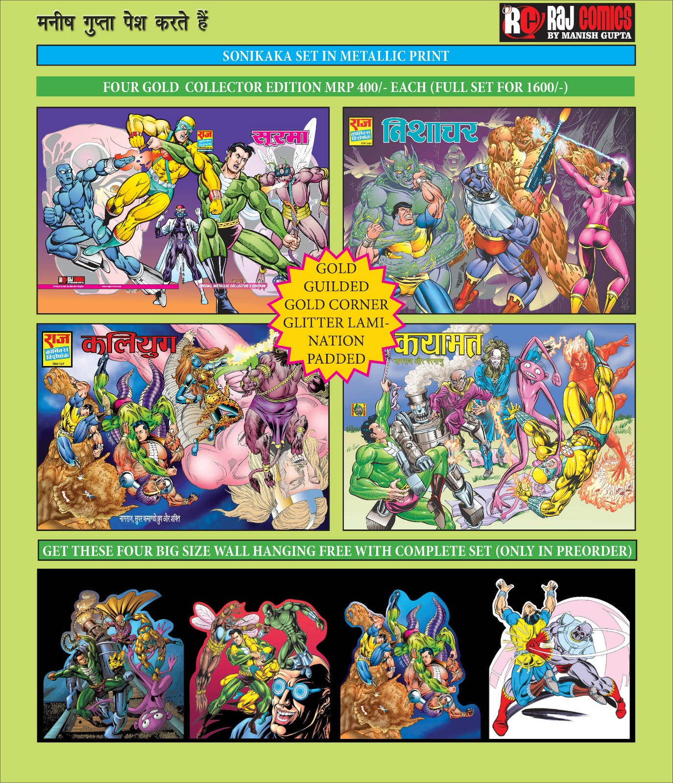Sonikaka set metallic gold,nishachar,kayamat,surma,kalyug,nagraj,dhruv,parmanu,raj comics,rcmcg,raj comics by manish gupta